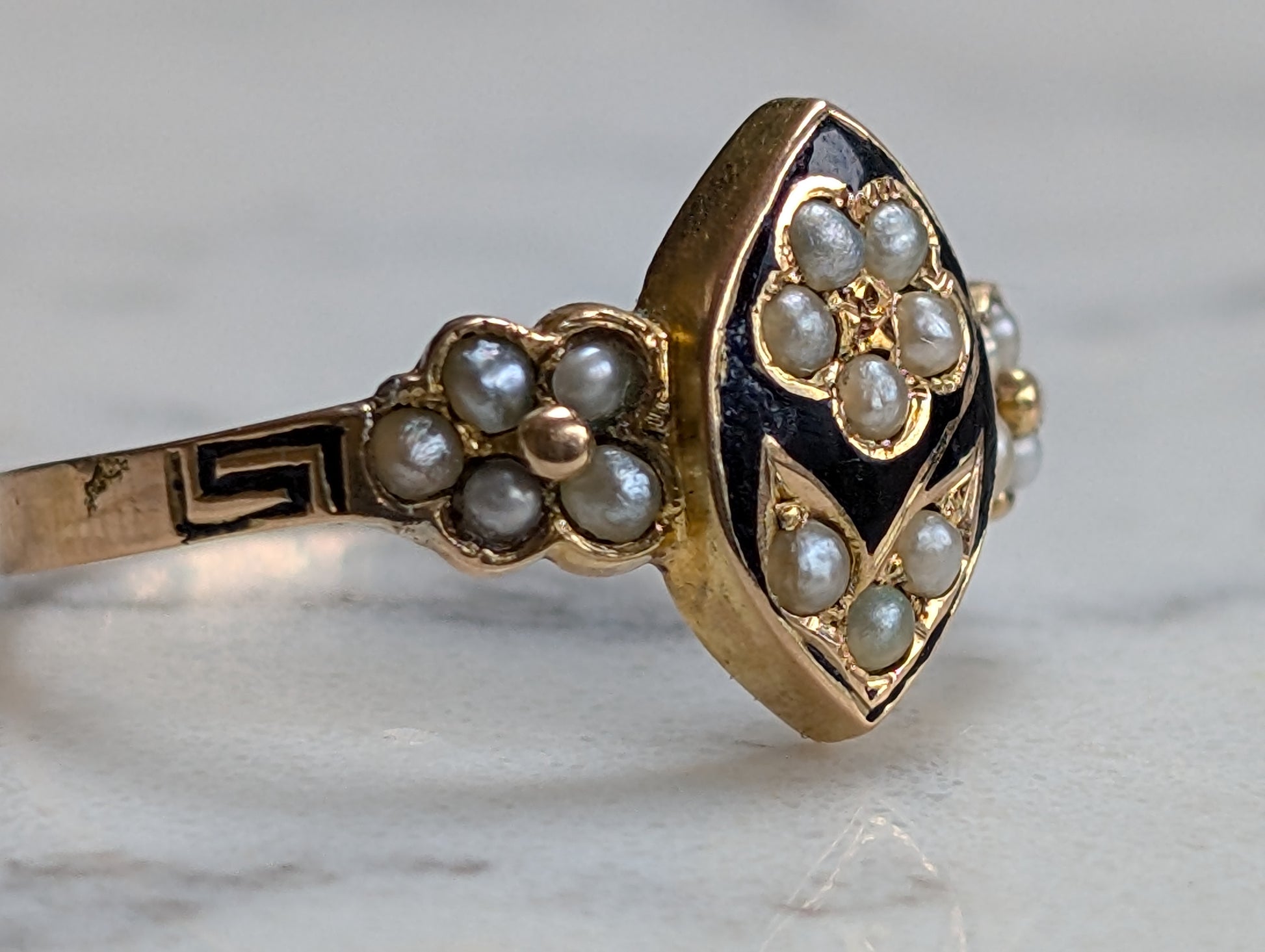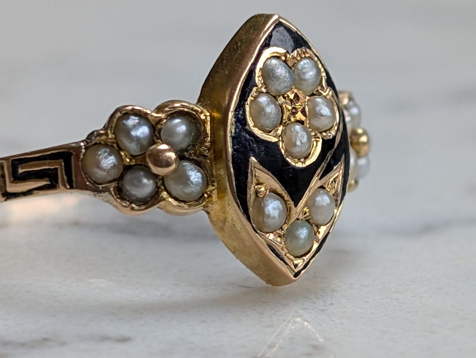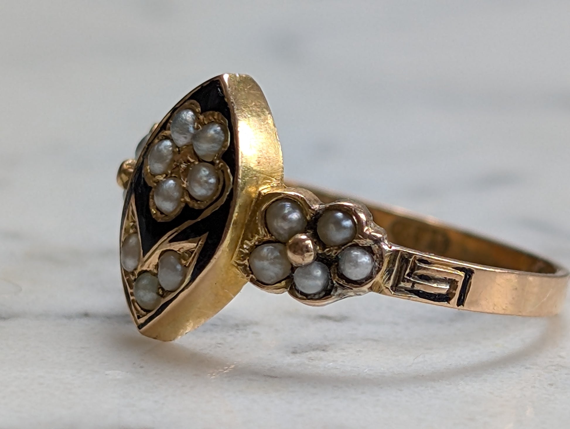 A wonderful 15ct yellow gold Victorian antique ring. The face is crafted in a navette style and features a flower of small seed pearls. Surrounding the daisy is well-kept black enamel which could signify that this ring was originally used as a mourning ring.