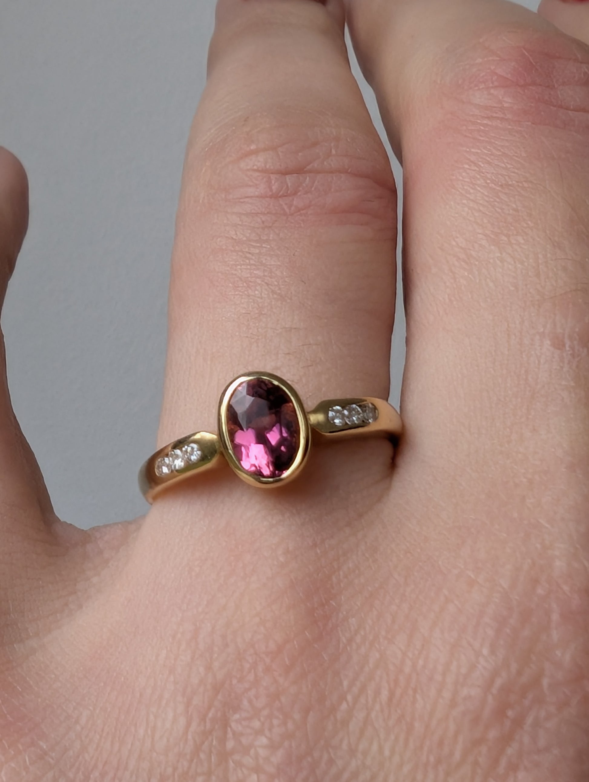 A beautiful pink Tourmaline and Diamond Solitaire Ring, crafted in 18ct yellow gold and featuring a beautiful oval cut Tourmaline centre stone with three round cut diamonds to either shoulder. The gemstones are all natural and the Tourmaline is 0.75ct and the diamonds are 0.015cts each. This piece weighs 3.5 grams and the ring head measures 9mm x 6.5mm.
